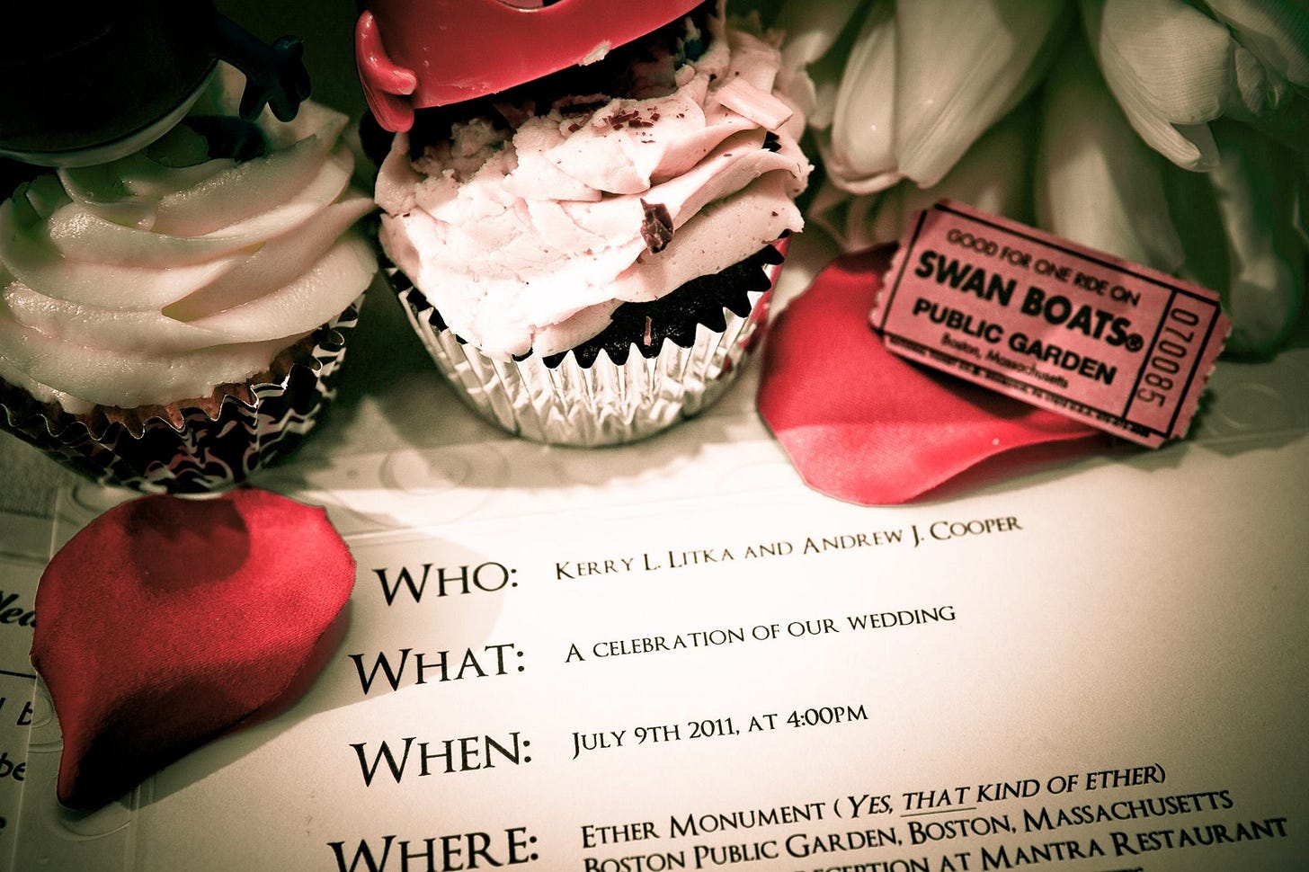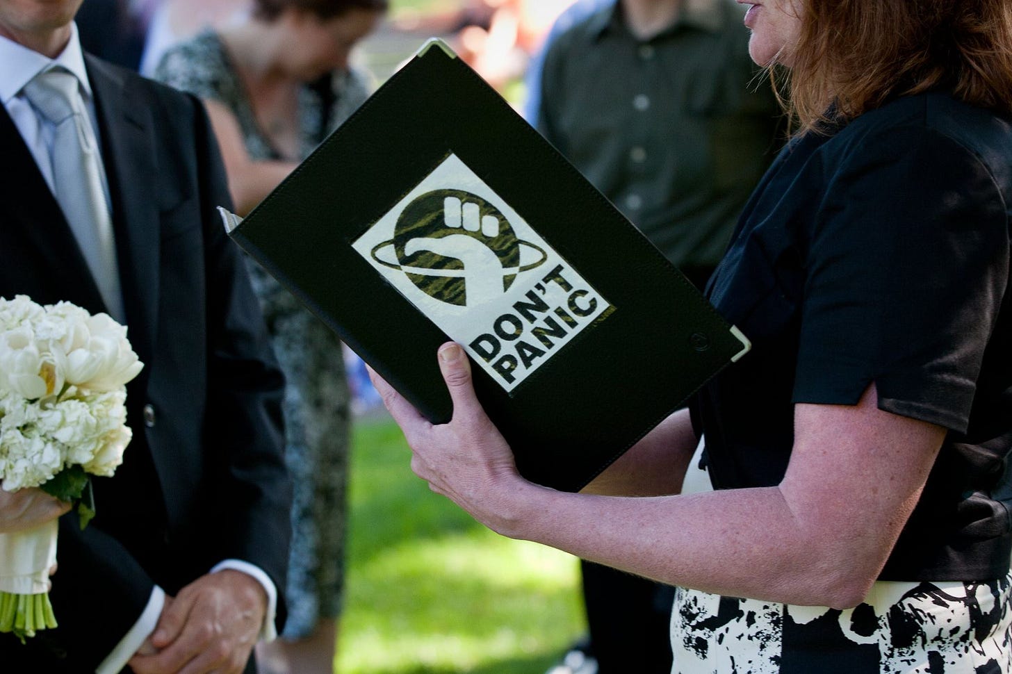 At our wedding, the officiant held a leather-bound folio containing all of the readings and pronouncements for our ceremony, on the front of which I had decorated to look like the cover of The Guide (including the words Don’t Panic inscribed in large, friendly letters). It was meant to be a marriage joke, but also a reference my username that ultimately was the source of our connection. The ceremony featured a reading from The Hitchhiker’s Guide to the Galaxy, and took place beside a monument commemorating the first use of general anesthesia in surgery, making it—almost certainly—the only wedding in recorded history to combine cosmic absurdity with medical mercy.